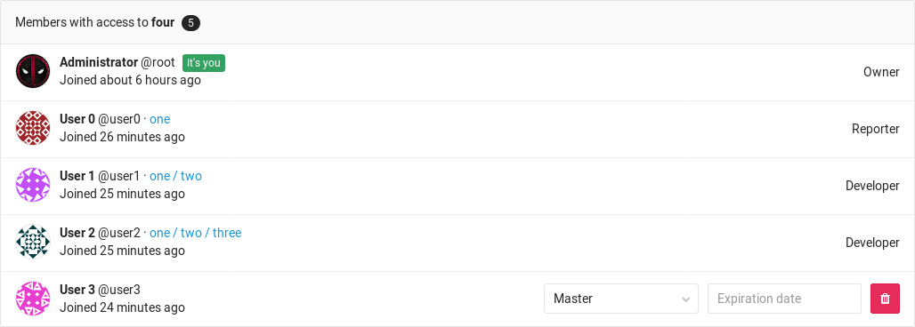 For example, if User0 was first added to group group-1/group-1-1 with Developer